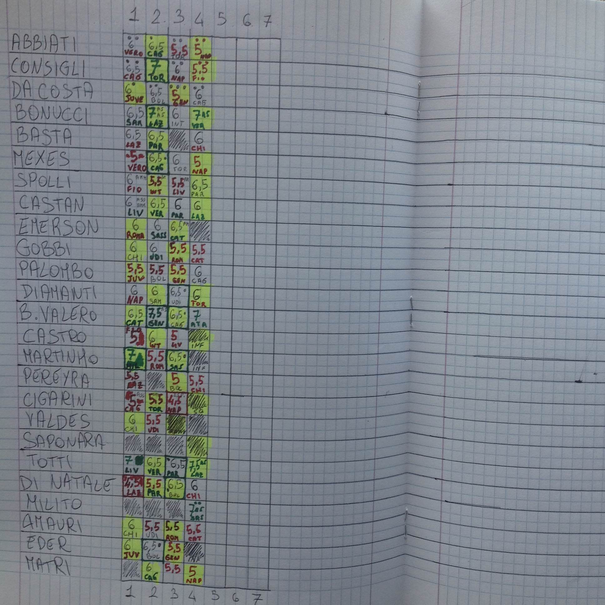 -Sotto al voto,andiamo a scrivere la squadra che ha affrontato in quella giornata il nostro calciatore,ed anche qui pennarello rosso in caso di sconfitta,verde in caso di vittoria e penna normale per un pareggio.