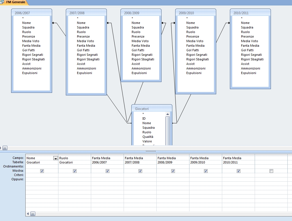 Da queste ho creato una query dove ho come base la lista dei Giocatori e vado a mettere in relazione questa tabella con ogni singola tabella delle statistiche (solo per quanto riguarda la FantaMedia)